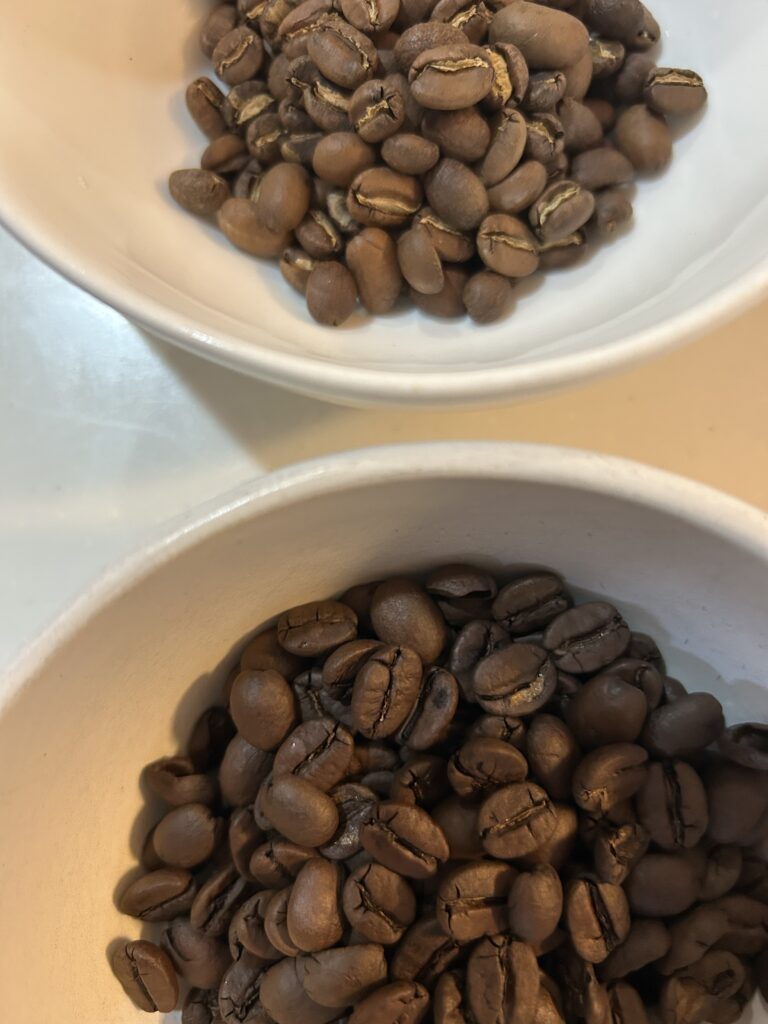 上の写真が浅煎り、下が深煎りです。